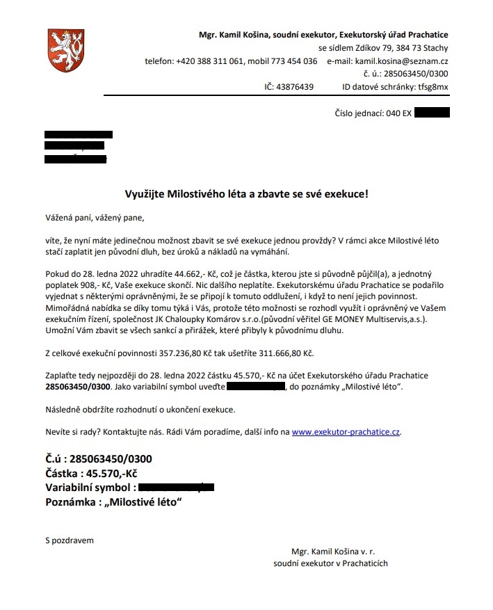 Dopisy obsahují základní informace vždy o konkrétní exekuci, kterou je možné uhradit za příznivých podmínek. Dlužník se díky tomu přesně dozví, jaká je právě v jeho exekuci původní dlužná částka, kolik činí celkový dluh s příslušenstvím a kolik ušetří, pokud nejpozději do 28. ledna 2022 zaplatí.